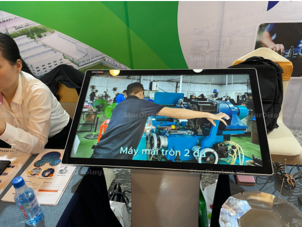 Thuê màn hình cảm ứng chân nghiêng : độ sáng màn hình cao, góc nhìn rộng, đảm bảo tầm nhìn ở mọi góc, hỗ trợ trình chiếu nhiều file khác nhau, hiển thị video và hình ảnh sống động, rõ ràng, tiện lợi, sang trọng, giúp người tham quan dễ dàng thao tác và trải nghiệm.