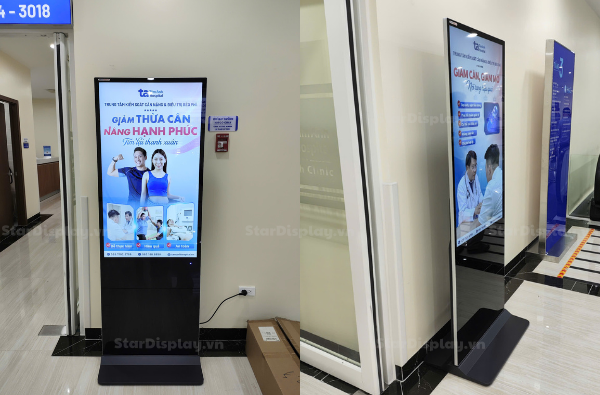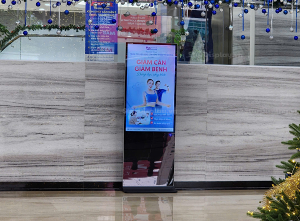 Màn hình quảng cáo chân đứng siêu mỏng : Kích thước màn hình đa dạng, phù hợp với mọi không gian. Thiết kế siêu mỏng, hợp thời trang, độ dày chỉ 18mm. Thay đổi nội dung tùy với Phần Mềm Tích Hợp Nội Dung. Độ phân giải Full Hd siêu mượt. Hiển thị cực sáng 350-400 nitts đáp ứng linh hoạt các điểu kiện ánh sáng khác nhau. Hoạt động bền bỉ 24/7 với vòng đời ≥50,000 giờ. Bề mặt sử dụng kính cường lực siêu trong suốt, khung hợp kim nhôm siêu bền.
