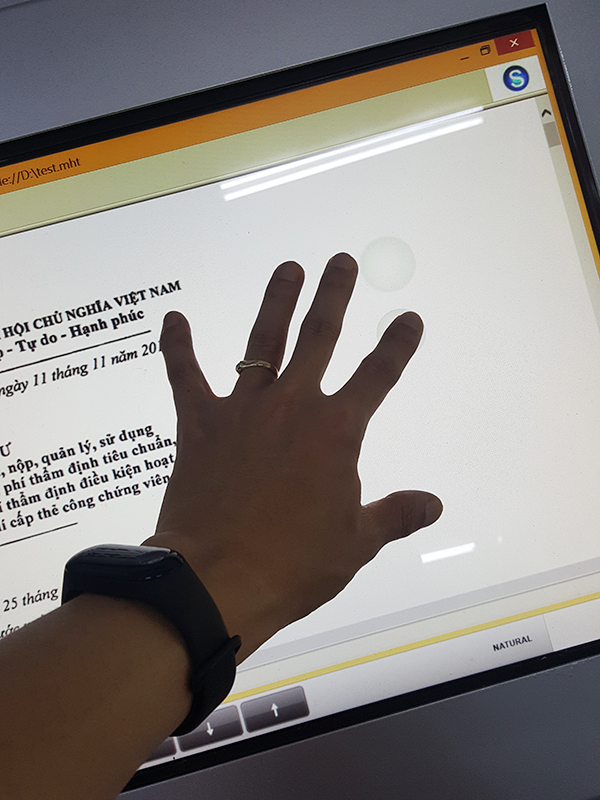 Màn hình tương tác mẫu mới có khả năng nhận đến hơn 10 điểm cảm ứng. Người dùng có thể dùng 2 tay để điều khiển nội dung hiển thị trên màn hình.