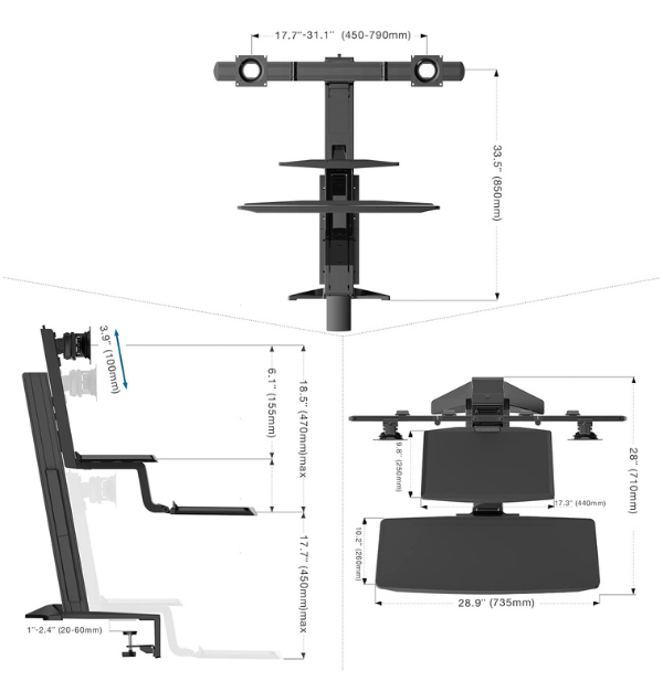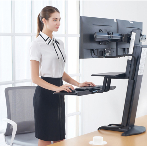 Chân đế gắn bàn 2 LCD L100 này bao gồm khay bàn phím và khay phụ phía trên, tích hợp với hai giá treo màn hình. Khay trên dùng để đựng cốc, bút, vở. Khay bàn phím đủ rộng để đựng bàn phím, chuột và có thể gấp gọn lại khi không sử dụng. So với các bàn làm việc đứng khác trên thị trường, nhiều khả năng đây là một bàn làm việc để tiết kiệm không gian và cải thiện sức khỏe.