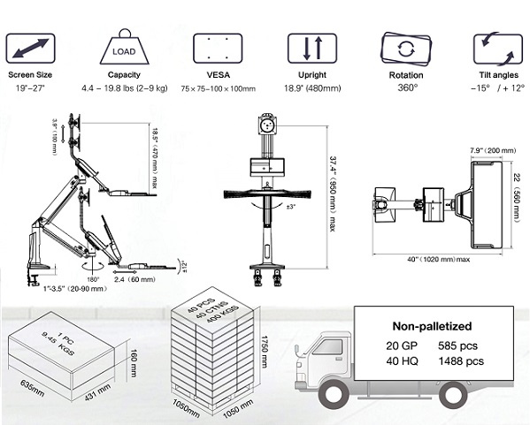 Khoảng cách từ mặt bàn đến tâm màn hình: 0-950mm
