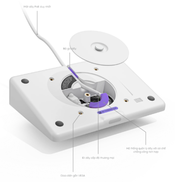 Đơn giản hóa việc thiết lập với một dây duy nhất có thể được đi thông qua mặt sau hoặc bên dưới thiết bị. Giữ cho các kết nối chặt chẽ với cơ chế giữ và chống căng dây tích hợp.