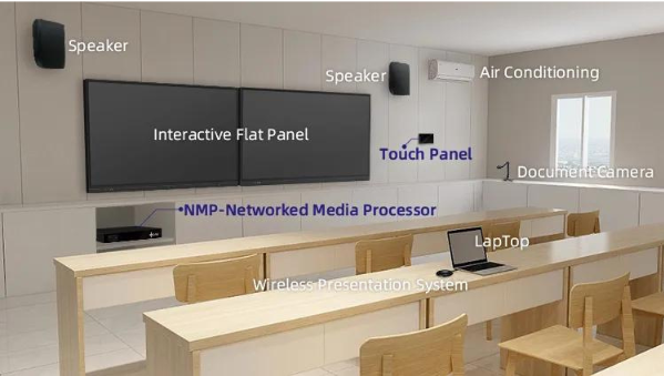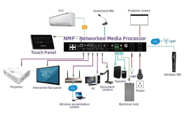 Thiết bị NMP có thể hoạt động như một công tắc mạng LAN. Bằng cách kết nối thiết bị NMP với máy chủ phương tiện Q-NEX, quản trị viên CNTT của trường có thể chọn phát trực tuyến nội dung và lựa chọn phát đến các lớp học khác nhau ngay lập tức hoặc theo lịch trình.