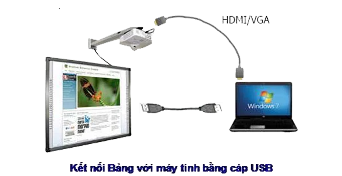Bước 3: Cắm dây touch có sẵn của bảng tương tác vào Laptop/PC. Chúng ta có thể tương tác trực tiếp trên bề mặt bảng sau khi bảng có tín hiệu thông báo đã kết nối được với Laptop