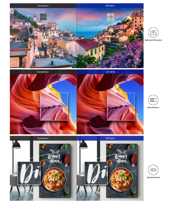 Thu hút mọi ánh nhìn của khách hàng với từng khung hình rõ ràng, sắc nét trên với dòng màn hình QET từ Samsung. Hiển thị hình ảnh sống động, chân thực với chất lượng cải tiến vượt trội.
