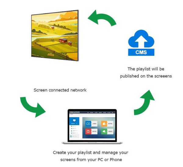 Hệ thống android với phần mềm cms : dễ dàng quản lý và trình chiếu nội dung bằng điện thoại hoặc máy tính.