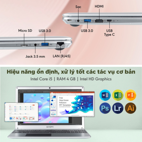 Laptop SingPC M16 được trang bị 2 cổng USB 3.0, HDMI, LAN (RJ45), Micro SD, Jack tai nghe 3.5 mm và USB Type-C hỗ trợ kết xuất dữ liệu và truyền tải thông tin đến các thiết bị ngoại vi tương thích như loa, chuột, máy in,... một cách dễ dàng và nhanh chóng mà không cần dây cáp rườm rà, phức tạp.