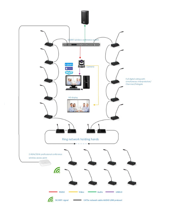 Giao tiếp không dây WiFi tiêu chuẩn 5G, với độ trễ ít hơn và âm thanh chất lượng cao trong khi không bị nhiễu tín hiệu 2.4G, chỉ mất vài phút thiết lập hệ thống để có thể sử dụng và mang đi