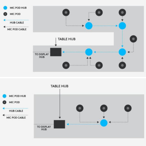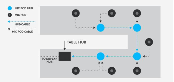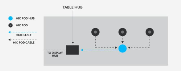 Loại bỏ việc đi dây qua bàn giữa các pod mic bằng cách kết nối chúng qua lỗ cáp tới hub bên dưới bàn. Điều này giữ cho dây âm thanh nằm ngoài tầm nhìn cho vẻ ngoài chuyên nghiệp.