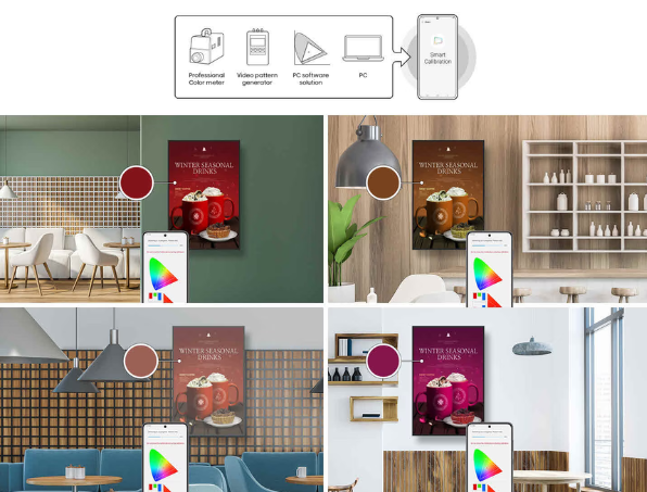 Hiệu chỉnh thông minh Smart Calibration: Đảm bảo tính nhất quán hoàn toàn của thương hiệu trên mọi màn hình ở mọi vị trí. Sử dụng ứng dụng Samsung dành cho thiết bị di động, Smart Calibration đảm bảo mọi màn hình đều được hiệu chỉnh một cách chính xác, hiển thị các biểu trưng thương hiệu và các tài liệu khác có màu sắc chính xác theo yêu cầu.
