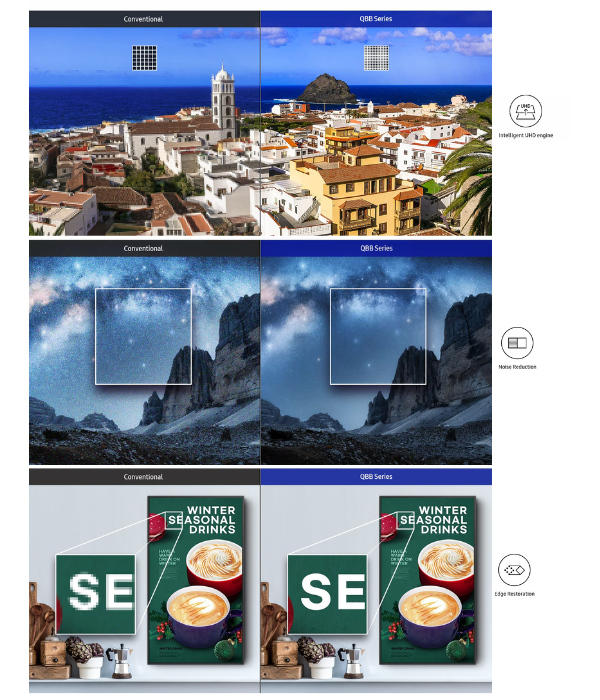 Màn hình chuyên dụng Samsung QBB với vi xử lý Qantum 4K hội tụ các tính năng chuyên nghiệp nâng cao, từ thiết lập đến bảo trì trong một thiết kế tuyệt đẹp giúp nâng tầm mọi môi trường kinh doanh. Từ việc cải thiện khả năng kết hợp với các thiết bị để giới thiệu nội dung phong phú ở các định dạng mới, QBB mang đến sự đổi mới và hiệu quả để giúp các doanh nghiệp đạt được mục tiêu của mình.