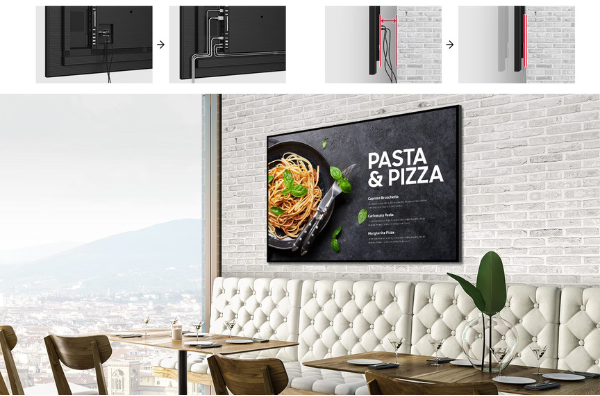Thiết kế mỏng và đối xứng: Viền mỏng và thiết kế đối xứng cho phép tích hợp liền mạch với mọi môi trường giúp đơn giản hóa việc lắp đặt. Để tiết kiệm không gian tối đa, tất cả các thiết bị đầu cuối đều hướng ra ngoài, đảm bảo màn hình treo thẳng trên mọi bề mặt tường.