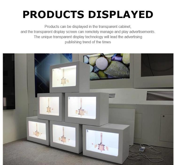 Tủ trưng bày LCD trong suốt có thể được sử dụng để chứa các mặt hàng thời trang trong cửa hàng bán lẻ hoặc các tác phẩm trong viện bảo tàng.
