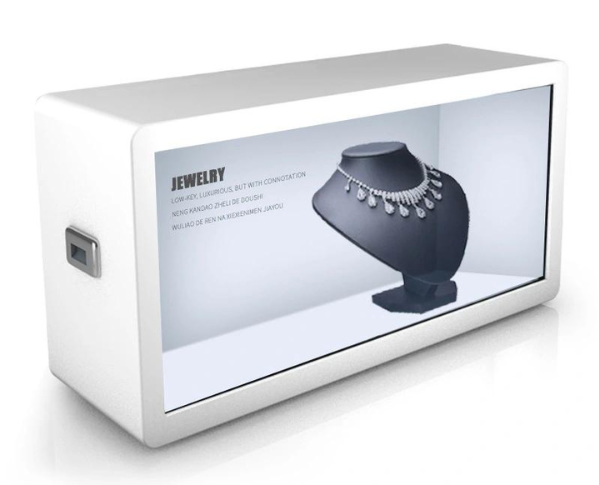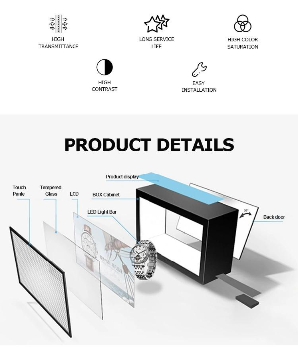 Đây là một bổ sung thú vị cho màn hình cửa sổ thông thường: Một màn hình cảm ứng LCD mỏng hoặc màn hình oled trong suốt, phủ lên Tủ trưng bày LCD trong suốt của riêng bạn cùng với sản phẩm được đặt bên trong. Màn hình phát một vòng lặp được lập trình sẵn, có thể là bất kỳ thứ gì từ tệp phản hồi tương tác đến video hấp dẫn sẽ xuất hiện để tương tác với sản phẩm của bạn.