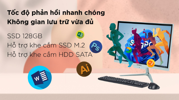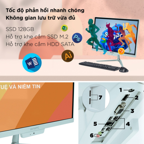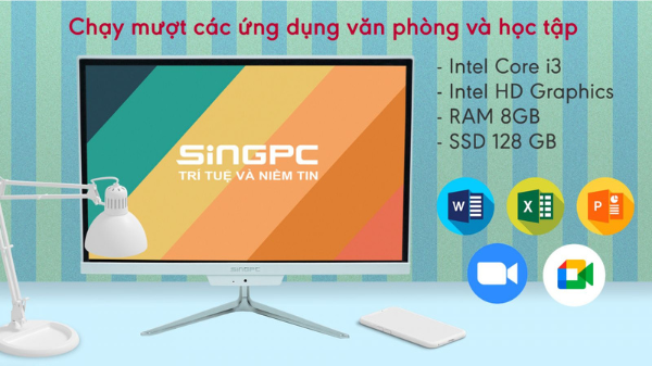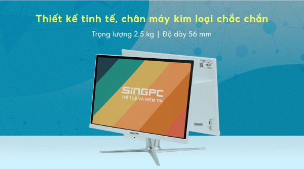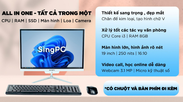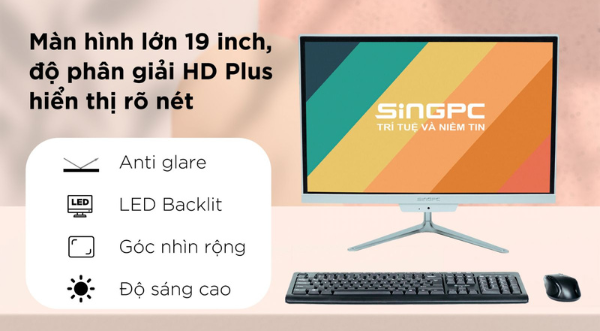 SingPC M19K là máy tính bàn nguyên bộ (All in one) có chuột và bàn phím không dây đi kèm, gây ấn tượng cho người dùng với thiết kế hiện đại và thuận tiện bằng cách tích hợp cả CPU, ổ cứng, loa, camera vào cùng một màn hình gọn nhẹ nhưng vẫn đảm bảo hiệu năng ổn định phục vụ tốt cho các công việc văn phòng hay học online.