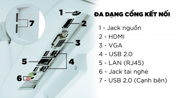 Mặt dưới của màn hình được tích hợp các cổng kết nối gồm: USB 2.0, LAN(RJ45), HDMI, VGA, Jack 3.5mm, sẵn sàng kết nối với các thiết bị khác bất cứ lúc nào. Ngoài kết nối có dây máy còn trang bị thêm kết nối không dây Bluetooth 4.2 cho phạm vi kết nối ổn định lên đến 10 m, WiFi chuẩn N cho tốc độ truyền tải nhanh chóng, phạm vi kết nối rộng.