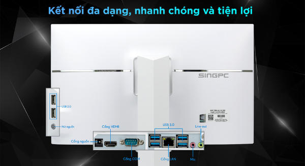 SingPC M24P được trang bị đa dạng các cổng kết nối phổ biến hiện nay như 2 cổng USB 2.0, 4 cổng USB 3.0, HDMI, COM và LAN (RJ45) hỗ trợ bạn liên kết với các thiết bị ngoại vi tương thích khác một cách nhanh chóng và dễ dàng.