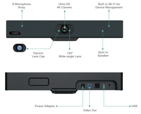 Thiết bị họp trực tuyến USB thông minh Yealink UVC34 sở hữu camera siêu HD 4K và ống kính góc siêu rộng 120°, đồng thời hỗ trợ zoom kỹ thuật số 5x, UVC34 mang lại chất lượng video vượt trội. Với nắp ống kính điện và các công nghệ AI bao gồm nhận diện khuôn mặt và chống ồn, v.v. đem lại cho người dùng những trải nghiệm hội nghị video thông minh và an toàn hơn. Với 8 dãy micrô và loa trung thực cao, UVC34 mang đến chất lượng cuộc gọi tuyệt vời ngay cả ở chế độ song công. Hơn thế nữa, UVC34 còn hỗ trợ quản lý thiết bị từ xa trên nền tảng quản lý thiết bị Yealink thông qua Wi-Fi tích hợp của nó.