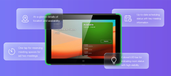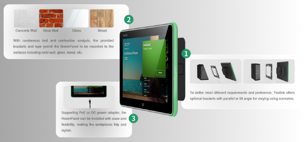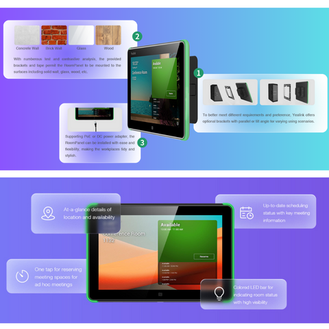 Yealink RoomPanel là bảng lịch trình phòng họp tất cả trong một 8 inch chạy Android 9.0 và đi kèm với hệ thống chiếu sáng nền LED RGB có thể lập trình đầy đủ để liên lạc ngay lập tức về trạng thái phòng. RoomPanel bao gồm khả năng cảm ứng 10 điểm, Wi-Fi 2×2 MIMO 802.11ac, Bluetooth 5.0, đầu đọc NFC / RFID tích hợp, dãy micrô và loa tăng cường để đáp ứng mọi nhu cầu về không gian làm việc hiện đại. Cũng được trang bị Power-over-Ethernet và nhiều loại giá đỡ, Yealink RoomPanel có thể dễ dàng gắn trên mọi bề mặt.