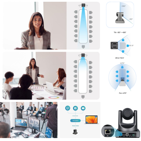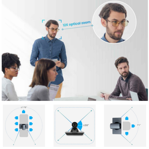 Camera công nghệ cao cho phòng họp nhỏ từ 4-6 người với 3 camera hỗ trợ góc nhìn 180 độ, khả năng auto tracking , nhận biết và hiển thị tập trung người đang trình bày